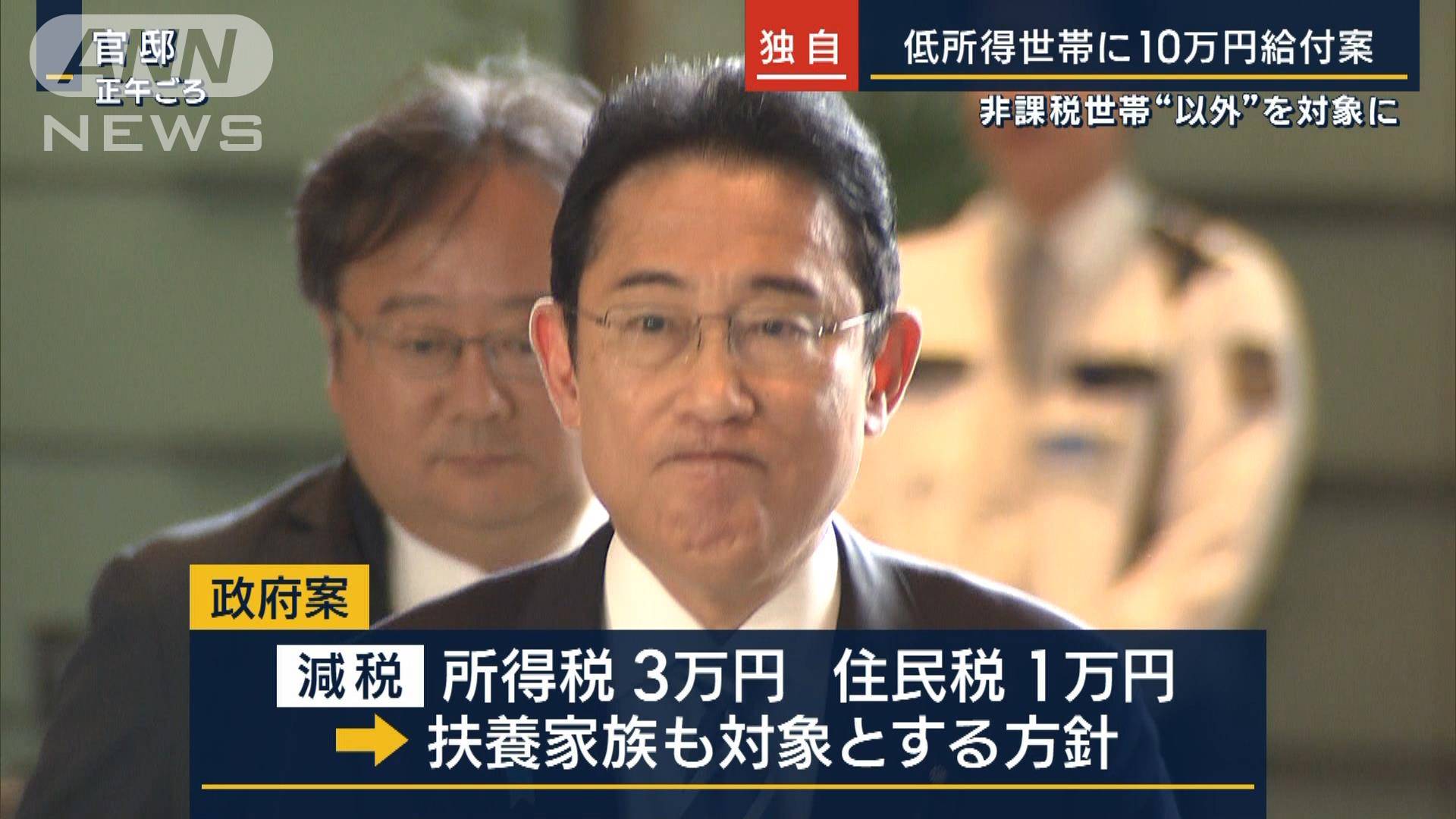 テレビ朝日系(ANN)政府は、国民への還元策として、非課税世帯以外の所得の低い世帯に10万円を給付する案を検討していることがわかりました。政府案では、所得税を3万円、住民税を1万円減税し、扶養家族も対象とする方針です。一方、給付については、この春に非課税世帯に対して3万円を給付していますが、今回、さらに7万円を給付する方針です。また、非課税世帯以外の所得が低い人に対しては、10万円の給付を検討しています。