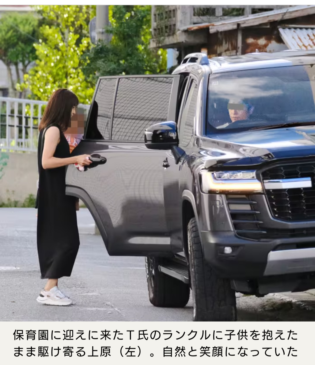 たとえば秋晴れのある夕方――園の近くにやってきたのは黒いランクル。わが子を保母さんから受け取るや、上原は笑顔で駆け付けたのだが――ハンドルを握るイケメンは「夫」でも、子供たちの「お父さん」でもなかった。上原の知人が俯きながら言う。