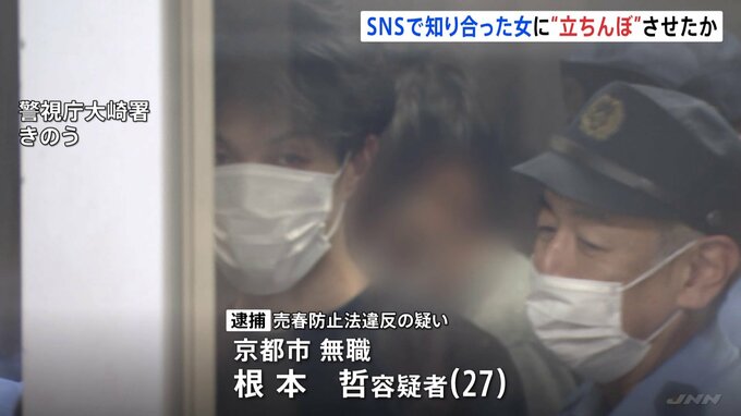根本哲容疑者(27)は、SNSで知り合った女(28)に新宿区の路上で、売春のための客待ち行為をさせた疑いがもたれています。