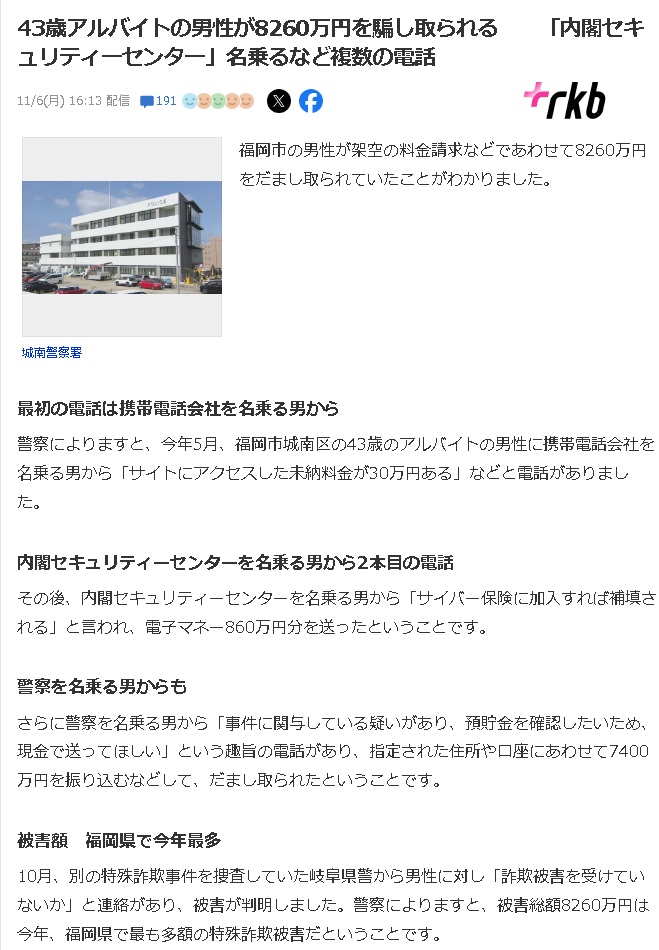 引用元: ・【多額】43歳アルバイトの男性が“8260万円”を騙し取られる「内閣セキュリティーセンター」名乗るなど複数の電話