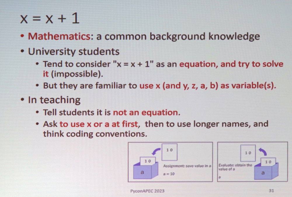そうした例として喜多教授は「x=x+1」というコードを挙げた。プログラミングを知っていれば変数の実装だということが分かるが、初めてプログラミングに触れる学生はこれを方程式だと考え、解けないと悩む。一方、数学を知っているため、xを変数として使うことには慣れている。まず「これは方程式ではない」というところから解説していくという。