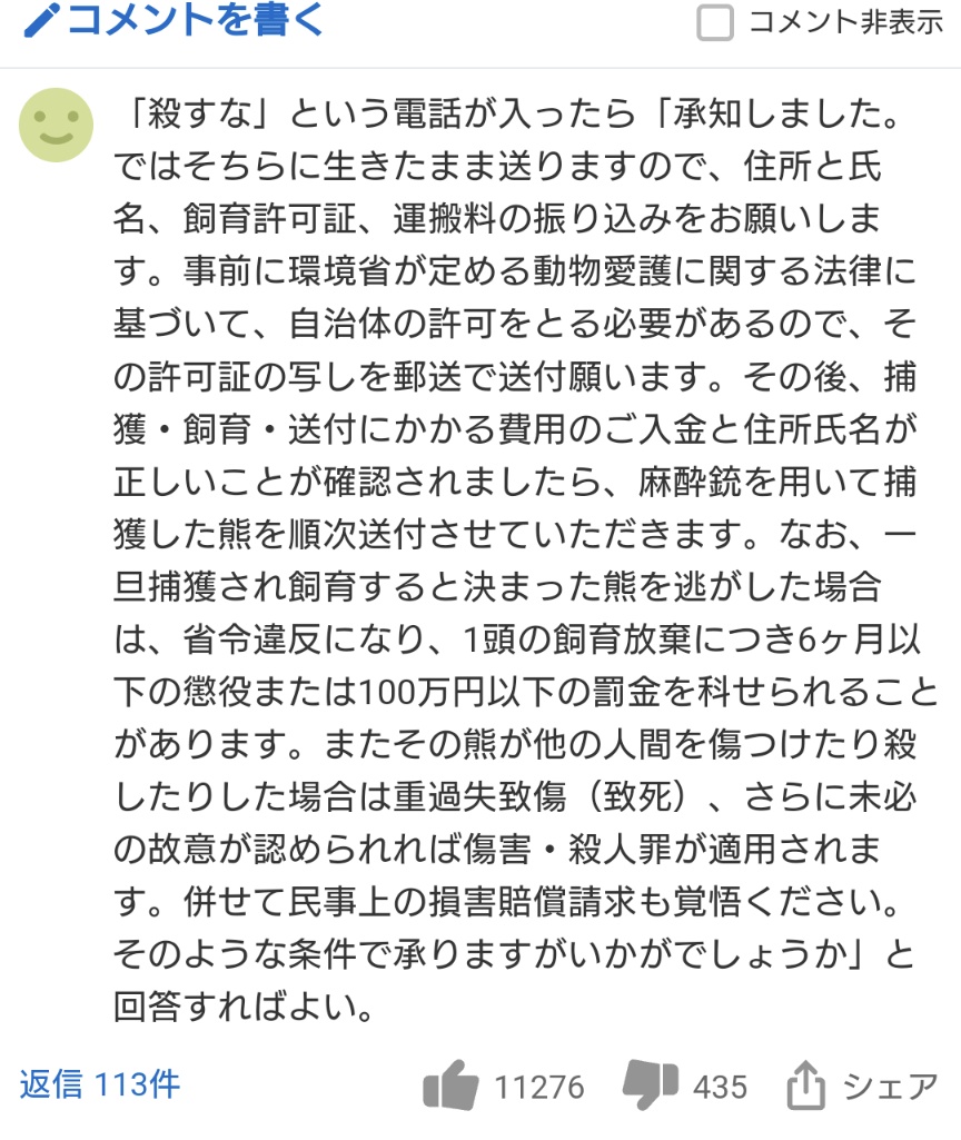 引用元: ・ヤフーコメント民、「クマを駆除するな」という苦情に対して正論を言い放つ