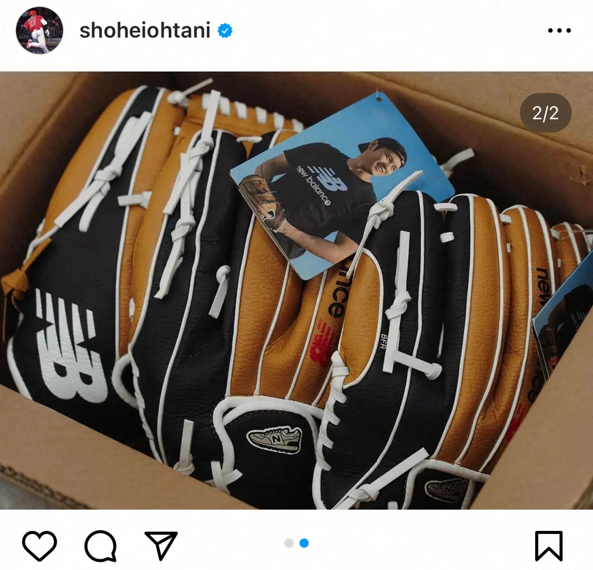 ニューバランスのロゴ入りグローブが詰められた段ボールの写真をアップし「このグローブを使っていた子供達と将来一緒に野球ができることを楽しみにしています!」と胸を膨らませた。