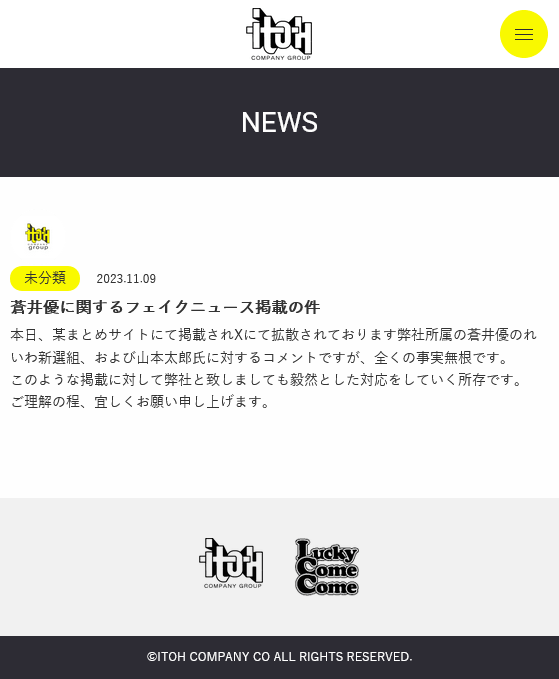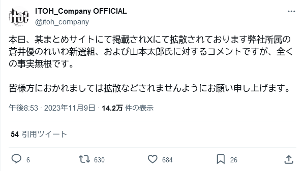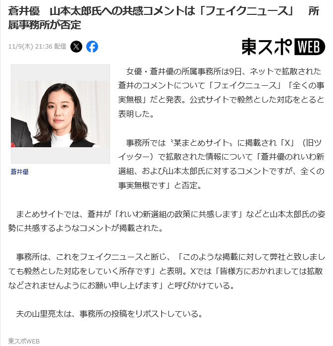 事務所の公式サイトでは「蒼井優に関するフェイクニュース掲載の件」と題し、「本日、某まとめサイトにて掲載されXにて拡散されております弊社所属の蒼井優のれいわ新選組、および山本太郎氏に対するコメントですが、全くの事実無根です」と否定。「このような掲載に対して弊社と致しましても毅然とした対応をしていく所存です」と表明した。