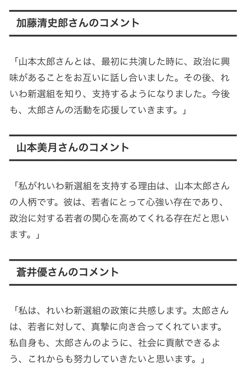 引用元: ・【悲報】れいわ支持者、蒼井優ら芸能人が山本太郎を応援するコメントを捏造 事務所に抗議される [135853815]