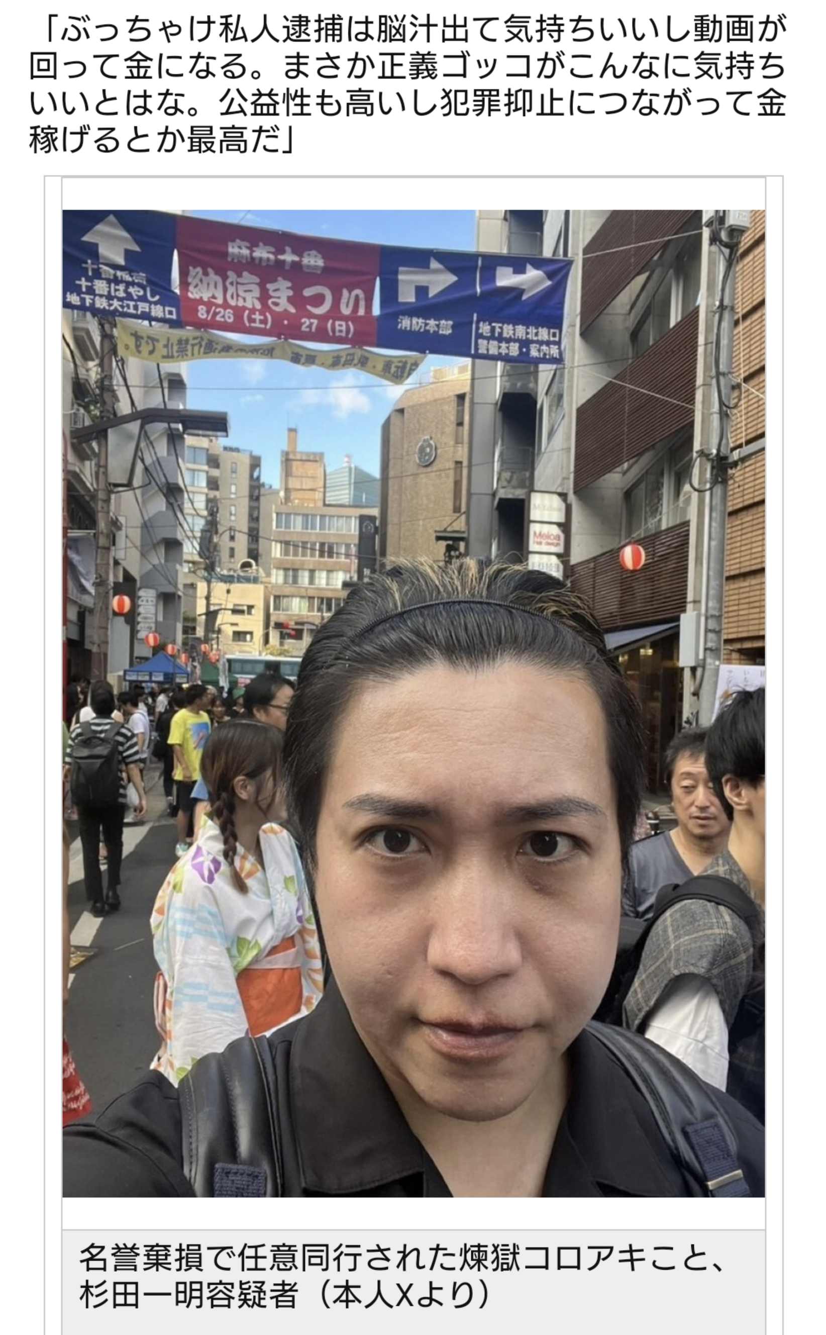 警察の護送車内で大きく口を開けアクビをし、だるそうに首を動かす。11月13日に警視庁生活安全特別捜査隊に名誉棄損の疑いで逮捕された、東京都武蔵野市の杉田一明容疑者(40)だ。迷惑系ユーチューバー「煉獄コロアキ」として活動していた男である――。