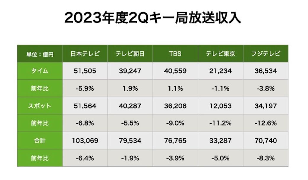 2023年度第2四半期では日本テレビ-6.4%、テレビ朝日-1.9%、TBSテレビ-3.9%、テレビ東京-5.0%、フジテレビ-8.3%と各局とも放送収入は前年比ダウンとなった。