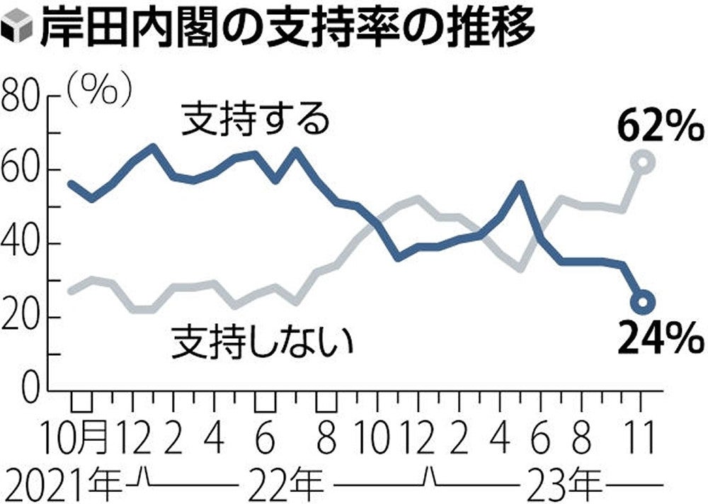 読売新聞社は17~19日、全国世論調査を実施した。岸田内閣の支持率は、2021年10月の内閣発足以降最低の24%となり、前回調査(10月13~15日)の34%から10ポイント下落した。不支持率は62%で、前回調査の49%より13ポイント上昇した。政府の経済対策への不満や政務三役の相次ぐ辞任などが、支持率下落に拍車をかけたとみられる。