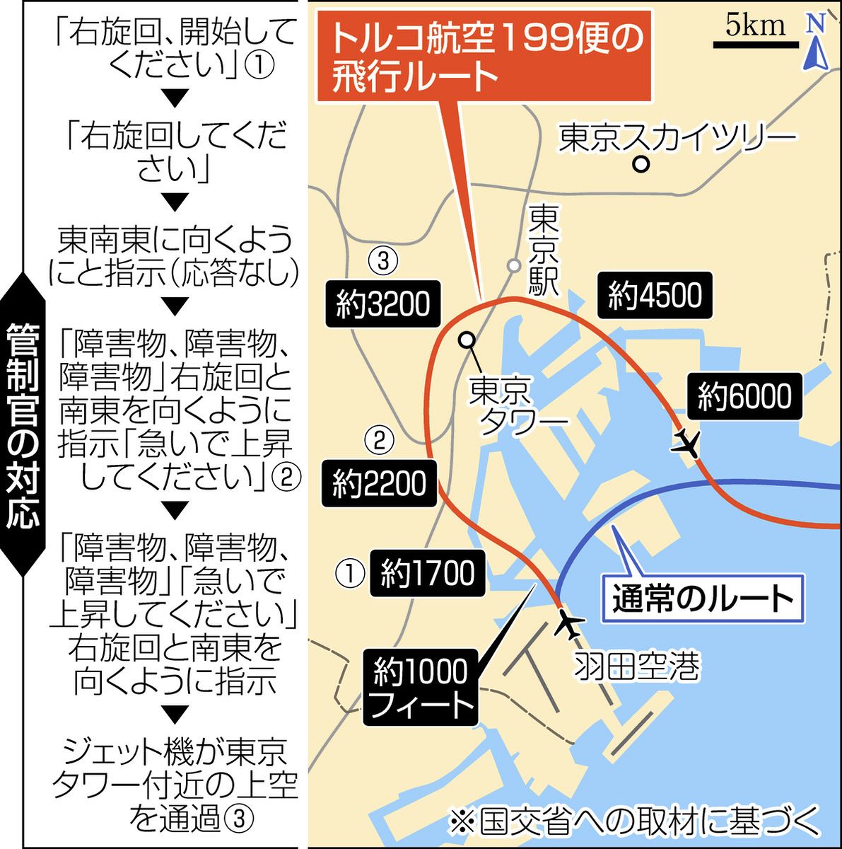東京・羽田空港を離陸したトルコ航空のジェット機が9月下旬、通常ルートを大きく外れて都心上空を飛んだ。東京タワー近くの上空に差しかかる前には、管制官から2度、「急いで上昇を」と指示されていた。