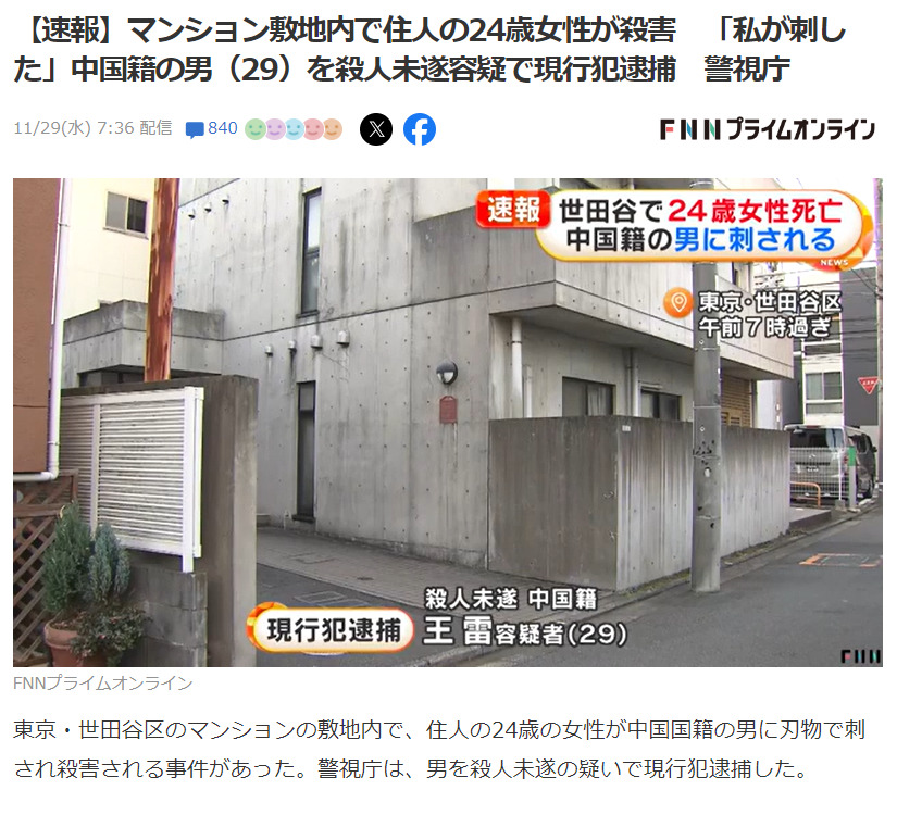 東京・世田谷区のマンションの敷地内で住人の24歳の女性が中国国籍の男に刃物で刺され殺害される事件がありました。