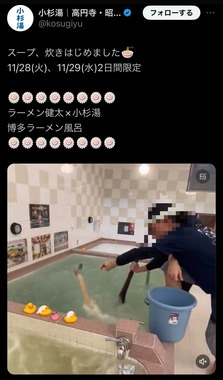 発端となった小杉湯の投稿では、「スープ、炊きはじめました」と宣伝し、「博多ラーメン風呂」と称したイベントを28、29日に実施すると予告した。約20秒の動画では、1人が浴槽のお湯に豚骨スープを入れ、もう1人がかき混ぜる様子が映っていた。