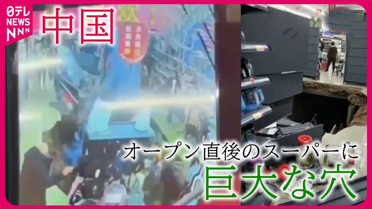 中国・河南省。オープンしたばかりのスーパーで突如、床が抜け落ちます。棚は、一瞬で穴の中に。予期せぬ出来事に、買い物客は後ずさりしました。足元にあいた穴は、棚2列分がすっぽりと入るほどの大きさです。