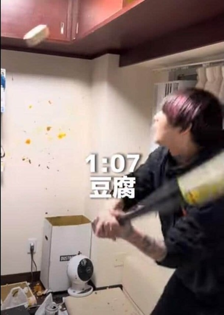 その後、肉まんを手に持ち、一瞬食べる仕草を見せたものの、再びバットで壁に打ちつける。さらにバナナを剥いて皮だけ口の中に入れたあと、果肉はバットで打ちつけた。続けて卵、鮭、カレーパン、赤飯おにぎり、豆腐をバットで打ち、壁と部屋は破壊された食べ物で汚れていった。