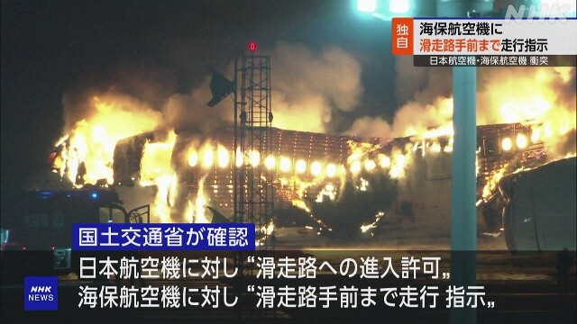2日、東京の羽田空港で日本航空の旅客機が着陸した直後に海上保安庁の航空機と滑走路上で衝突して炎上し、海上保安庁の乗組員5人が死亡した事故で、国土交通省が確認したところ、事故の前、管制官からは日本航空機に対して滑走路への進入許可が出ていた一方、海上保安庁の航空機に対しては滑走路手前まで走行するよう指示が出ていたことがわかりました。