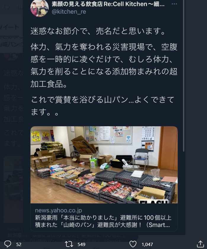 福岡の飲食店が山崎を痛烈批判「添加物まみれのパンを被災者に食べさせる迷惑な売名」 え?!