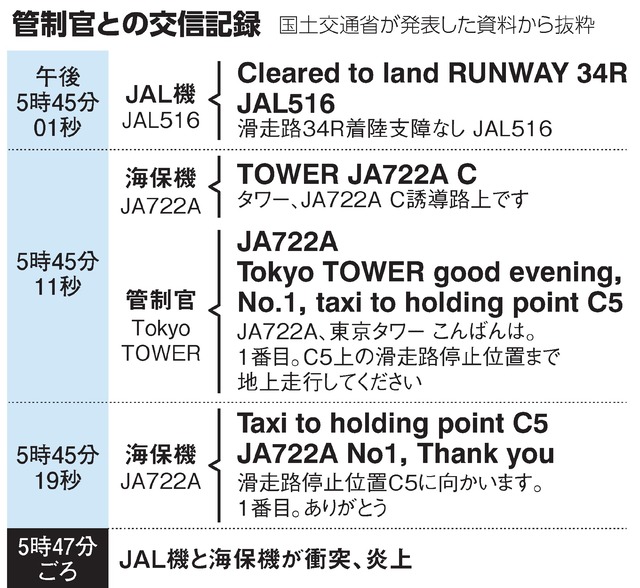 国土交通省が3日に公表した管制官との交信記録には、事故直前の管制官と両機とのやりとりが残されている。