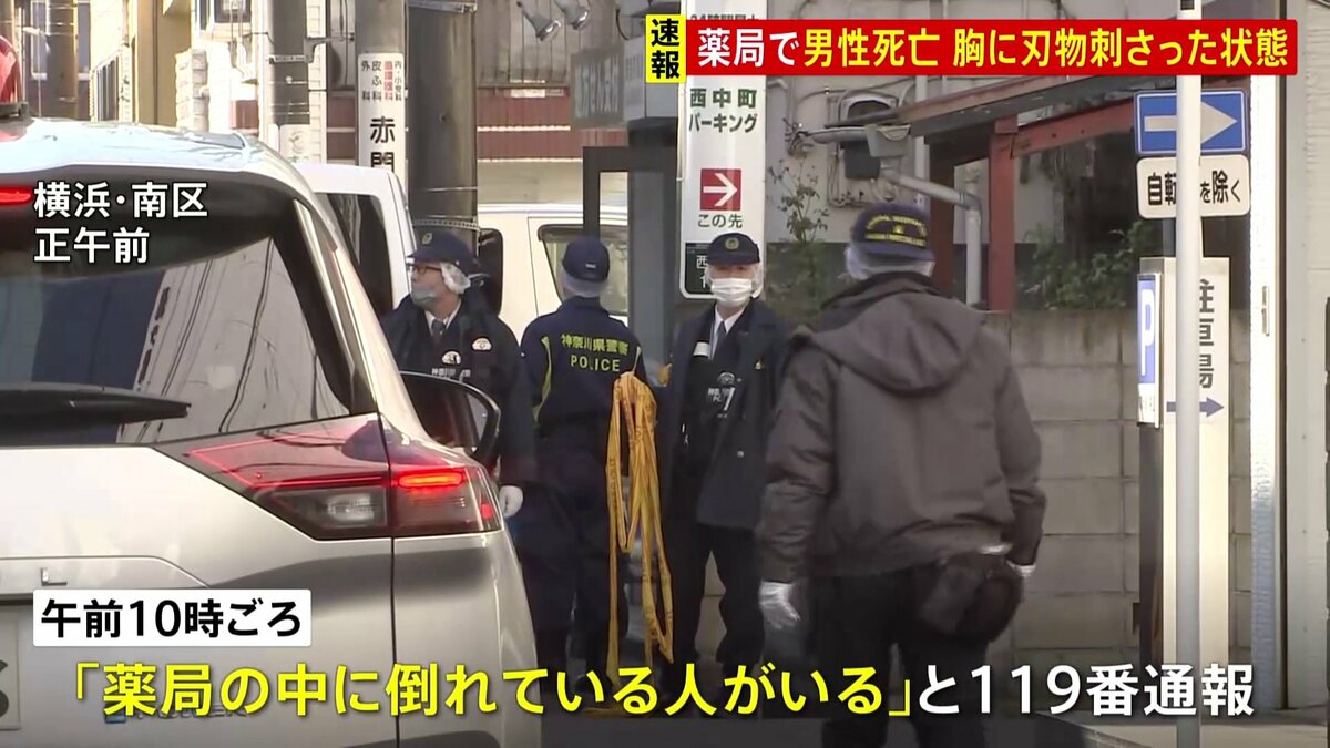 きょう午前、横浜市の薬局で、中年の男性が胸に刃物が刺さっている状態で死亡しているのが見つかりました。警察は事件の可能性もあるとみて、調べています。