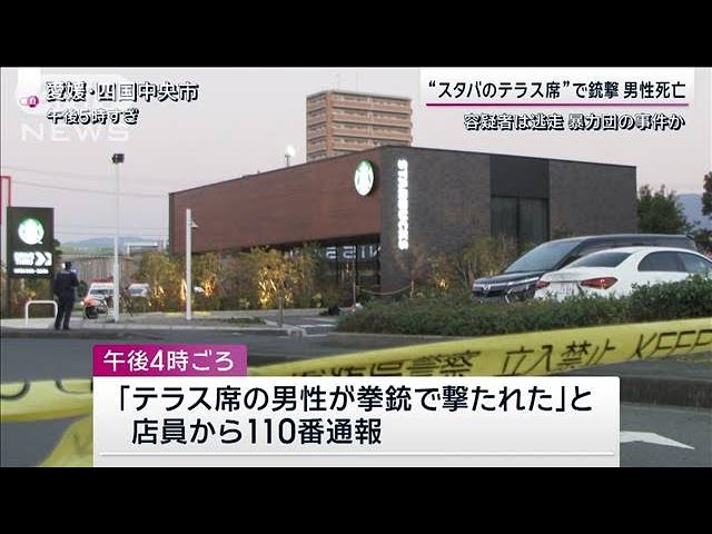 14日午後4時ごろ、愛媛県四国中央市妻鳥町のスターバックスコーヒーイオンタウン川之江店で、「男性が銃のようなもので撃たれてけがをしている」と110番通報があった。男性は胸あたりから血を流し、搬送先の病院で死亡した。撃ったとみられる人物はその場から逃走しており、県警四国中央署は殺人容疑などで捜査している。