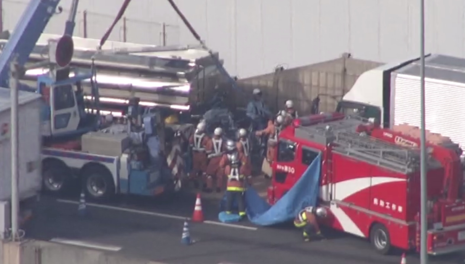 警察によりますと、大型トレーラー、タンクローリー、軽自動車の順で走っていたところ、軽自動車に大型トラックが追突したということです。軽自動車は大破し、厚さ数十センチほどに押しつぶされていて、警察などが救出作業にあたっています。