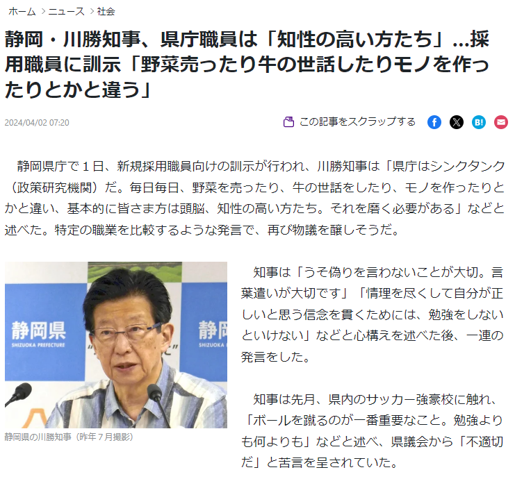 静岡県庁で1日、新規採用職員向けの訓示が行われ、川勝知事は「県庁はシンクタンク(政策研究機関)だ。毎日毎日、野菜を売ったり、牛の世話をしたり、モノを作ったりとかと違い、基本的に皆さま方は頭脳、知性の高い方たち。それを磨く必要がある」などと述べた。特定の職業を比較するような発言で、再び物議を醸しそうだ。