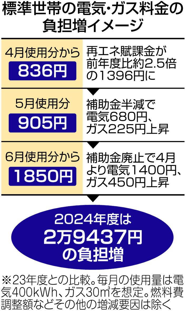電気・ガス料金の負担を軽減する政府の補助金が、5月使用分を最後に終了する。電気料金は、再生可能エネルギー普及のため料金に上乗せされる賦課金も2024年度は増える。その結果、本年度の電気・ガス料金は標準世帯で約3万円の負担増になる。物価高に加え、実質賃金が23カ月連続のマイナスと、家計の厳しさが増す中、消費行動への影響も懸念される。(山中正義)