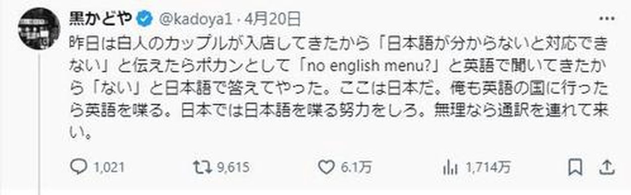 「昨日は白人のカップルが入店してきたから『日本語が分からないと対応できない』と伝えたらポカンとして『no english menu?』と英語で聞いてきたから『ない』と日本語で答えてやった。ここは日本だ。俺も英語の国に行ったら英語を喋る。日本では日本語を喋る努力をしろ。無理なら通訳を連れて来い」と投稿。