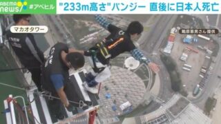 1: 名無し 2023/12/06(水) 12:53:59.43 ID:Xjd+1W0r9 12月3日、地上233mの高さから時速約200kmで急降下するマカオタワーのバンジージャンプを飛んだ56歳の日本人の男性が亡くなった。 男性は、バン...