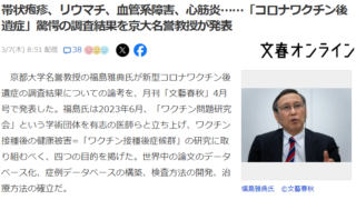ニュース速報 【コロナワクチン】帯状疱疹、リウマチ、血管系障害、心筋炎……「コロナワクチン後遺症」驚愕の調査結果を京大名誉教授が発表 1: 名無し 2024/03/07(木) 10:07:39.88 ID:??? TID:bolero 京都大学名誉教授の福島雅典氏が新型コロナワクチン後遺症の調査結果についての論考を、月刊「文藝春秋」4月号で発表した。福島氏は2023年6... 2024.03.07 ニュース速報